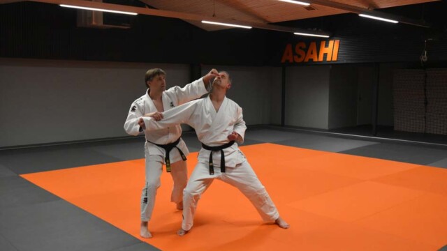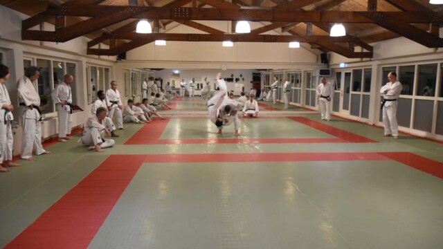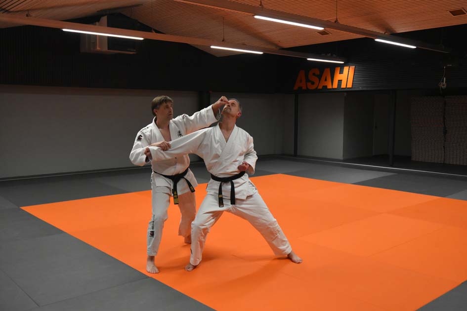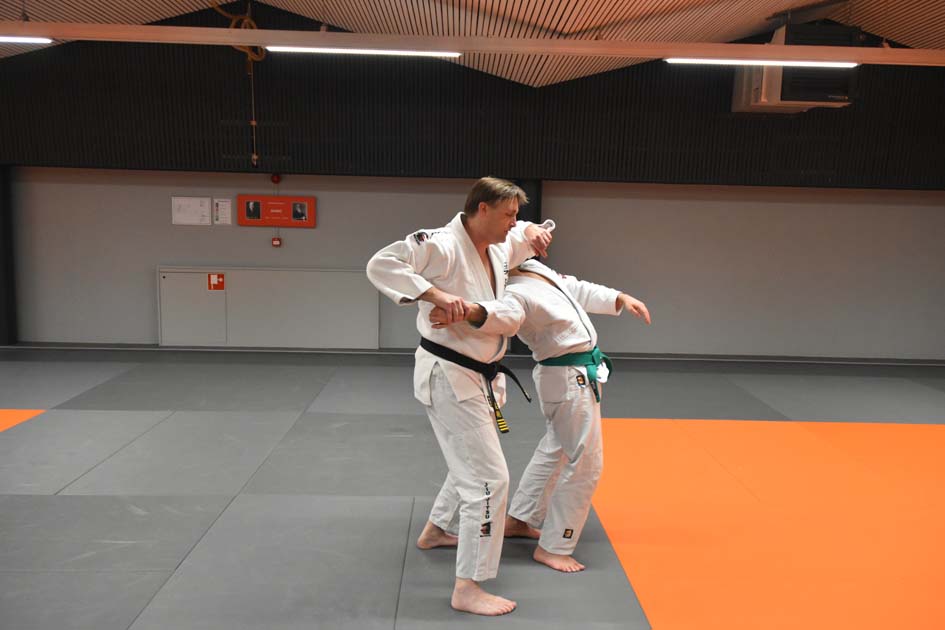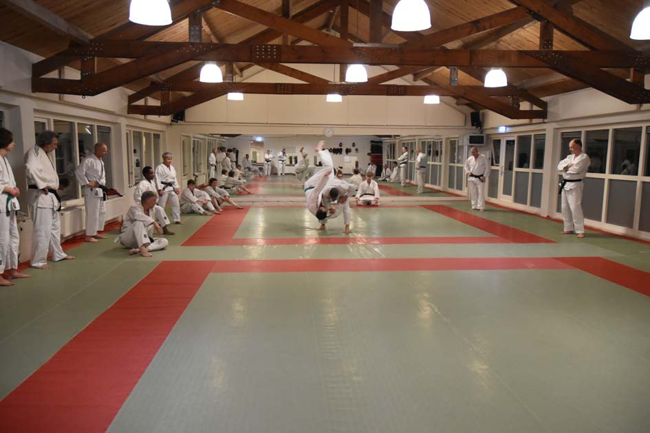Als eerste bezochten zij de prachtige dojo van Asahi in Assen. Dit is de dojo waar ook de examens van de Judo Bond Nederland worden gehouden voor zowel Jiu Jitsu als Judo. Onze districtstrainingen vinden hier iedere maand plaats, maar dit keer trainden Wanda en Berry mee met een reguliere groep. Gerrie Dusseljee geeft hier les aan een grote groep met een hoog niveau, wat ook goed zichtbaar is aan de vele zwarte banden op de mat.